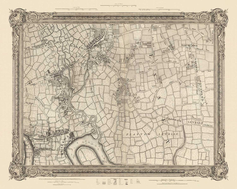 Publicado hace casi 300 años por el maestro cartógrafo John Rocque, este es el primer mapa detallado del Este de Londres. Fue publicado originalmente en 1746, tras un levantamiento altamente preciso de Londres y sus suburbios que comenzó en 1740. Es un hermoso, altamente detallado y extremadamente raro mapa antiguo.