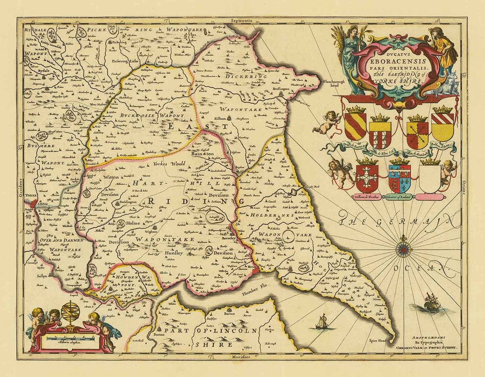 Esta deliciosa y detallada mapa coloreada a mano, extremadamente rara del East Riding de Yorkshire (ahora simplemente East Yorkshire) fue publicada originalmente en 1690 por Valk & Schenk, un dúo maestro de cartografía que trabajó en Ámsterdam en el siglo XVII.