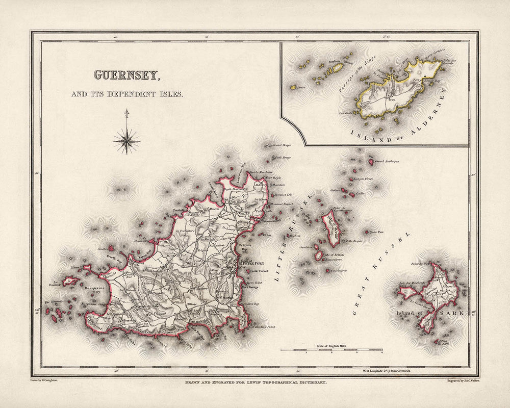 Mapa antiguo de Guernsey por Samuel Lewis, 1844: St. Peter Port, St. Sampson, Vale, Castel, Sark