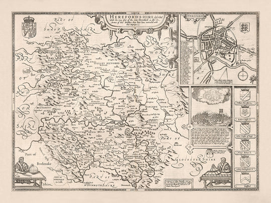- Mapa monocromo del condado de Herefordshire: Presentado en blanco y negro, característico de la cartografía de principios del siglo XVII.