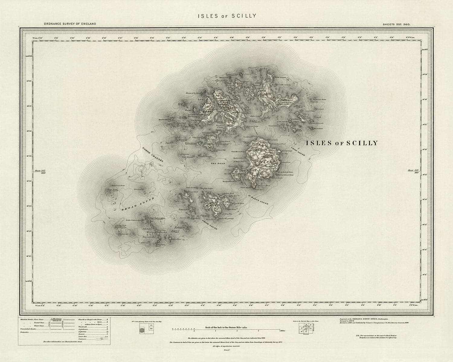 El mapa muestra todas las islas habitadas de Scilly, incluyendo St Mary's, Tresco, St Martin's, St Agnes y Bryher. El mapa es increíblemente detallado, aunque - todas las diversas rocas e islotes deshabitados también están mostrados aquí, incluyendo sus elevaciones sobre el nivel del mar.