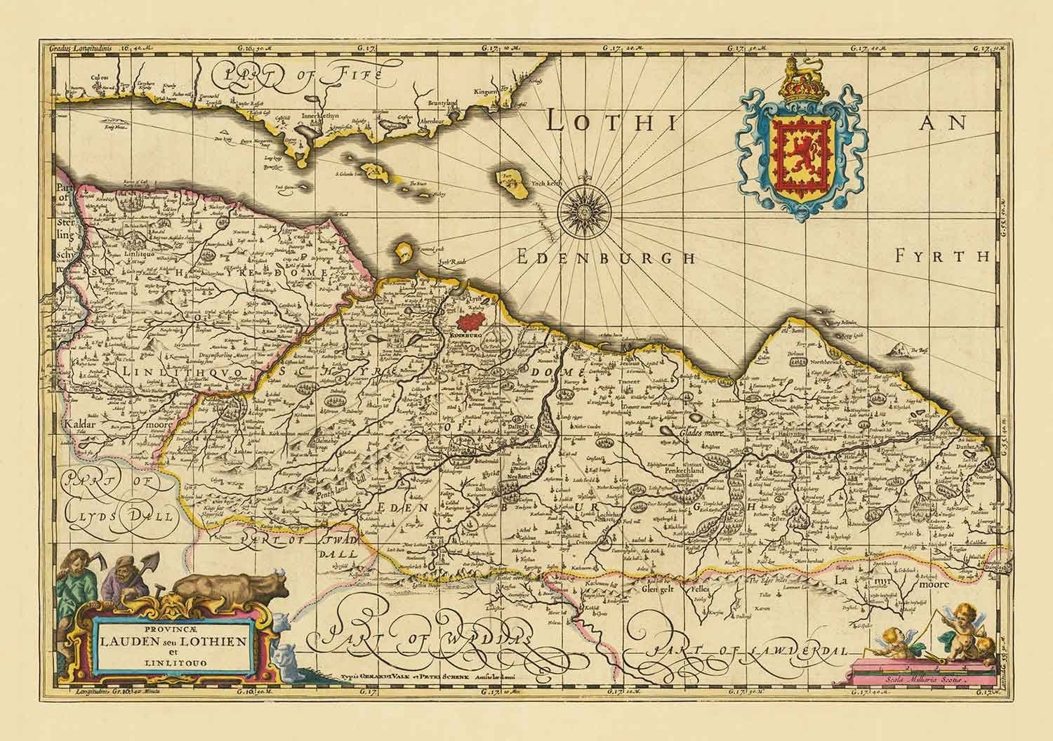 La esquina superior derecha del mapa muestra un escudo de armas de Escocia maravillosamente iluminado. El estuario de Forth domina la parte superior del mapa y se puede ver Inverkeithing justo al otro lado del río.