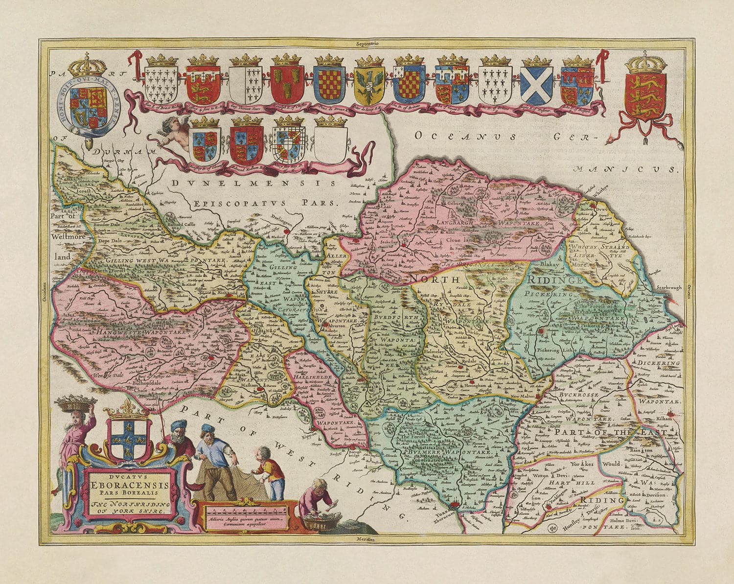 Mapa antiguo de North Yorkshire, 1665 de Joan Blaeu: York, Middlesbrough, Scarborough, Whitby, Malton, Pickering, Richmond