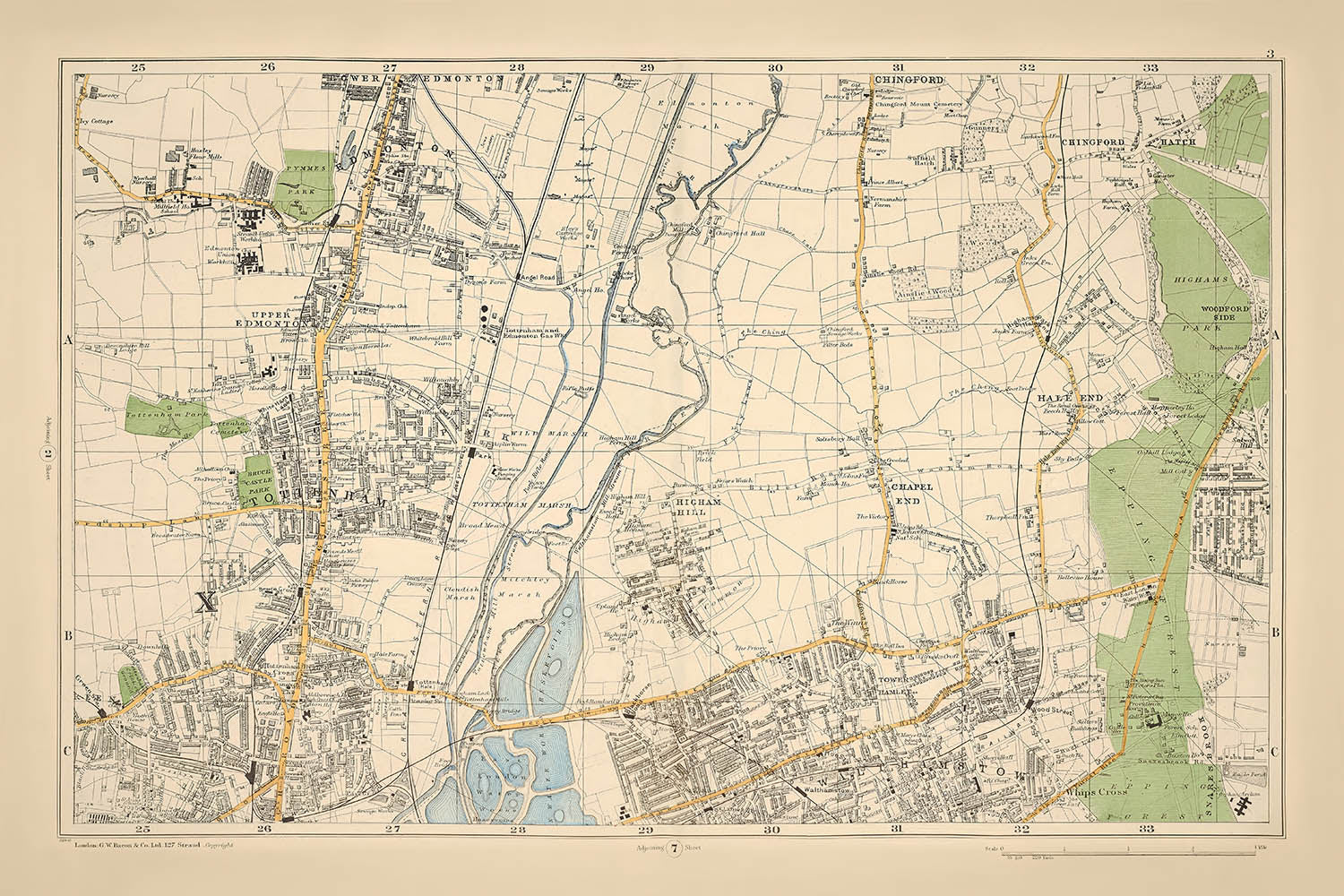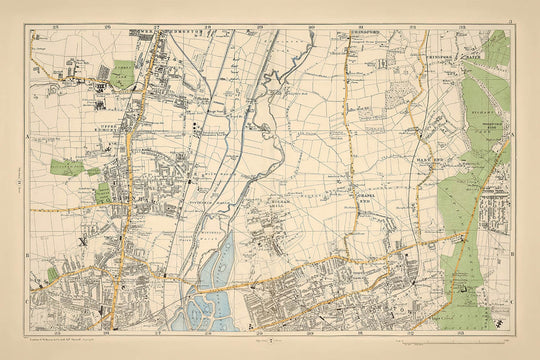 Este mapa destaca vecindarios significativos como Edmonton, Tottenham y Walthamstow, cada uno rico en significado histórico y preparado para el crecimiento. Edmonton, con raíces que se remontan al Domesday Book, estaba en transición de un pueblo rural a un suburbio bullicioso. Tottenham, conocido por su vibrante comunidad y sitios históricos, estaba a punto de convertirse en una parte clave del tapiz urbano de Londres. Walthamstow, con su encantadora mezcla de industria y vegetación, ofrecía una instantánea única de la vida suburbana.