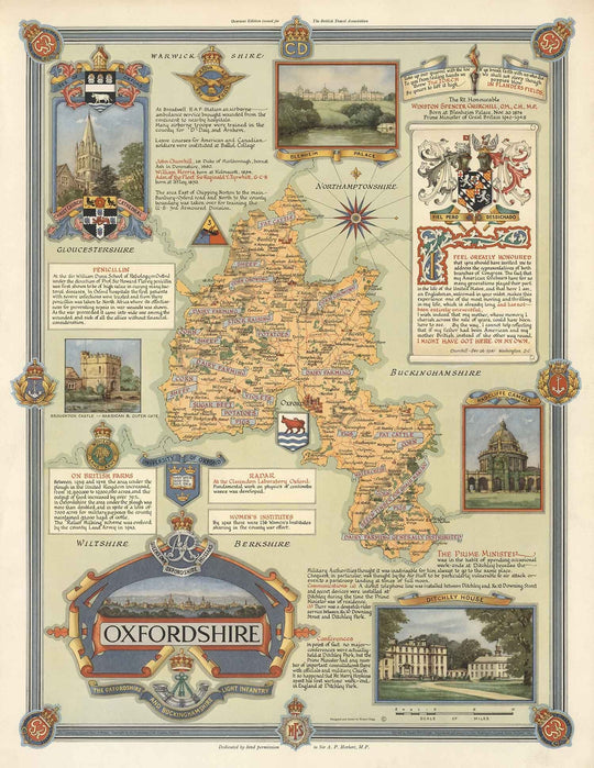 Además de un mapa detallado del condado en el centro, Clegg ha adornado este mapa con una serie de ilustraciones muy detalladas y atractivas de lugares emblemáticos de Oxfordshire. Estos incluyen el Palacio de Blenheim, la Cámara Radcliffe, el Parque Ditchley y la Catedral de Christchurch. También hay una cita de Winston Churchill, algunas cosas relacionadas con la Segunda Guerra Mundial, las famosas invenciones de la Universidad de Oxford... ¡y más!