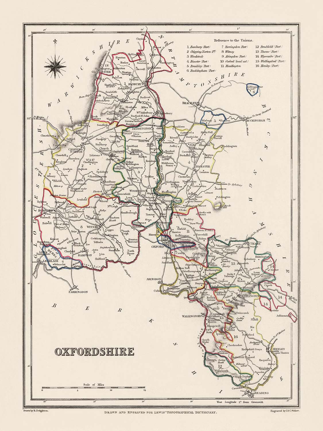Antigua mapa de Oxfordshire por Samuel Lewis, 1844: Oxford, Banbury, Abingdon, Bicester y Witney