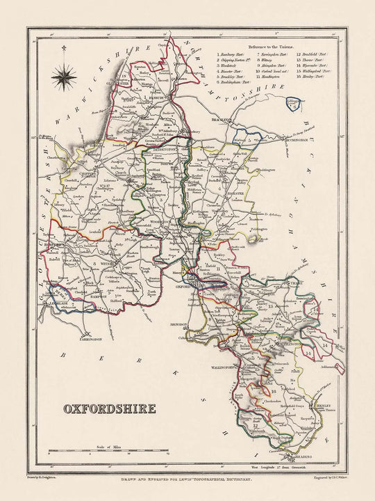 Este mapa exquisitamente detallado y rico en historia de Oxfordshire de 1844, del notable cartógrafo Samuel Lewis, proporciona una fascinante instantánea de uno de los condados más históricos de Inglaterra durante un período de inmenso cambio social e industrial. Cada línea dibujada a mano y cada nombre grabado meticulosamente cuentan la historia de un tiempo y un lugar que sentaron las bases de la moderna Oxfordshire que conocemos hoy. Cada asentamiento, desde la aldea más pequeña hasta la ciudad más grande, ofrece una ventana al pasado, algunos de los cuales han crecido hasta convertirse en ciudades modernas, mientras que otros han permanecido encantadoramente inalterados a lo largo de los siglos.
