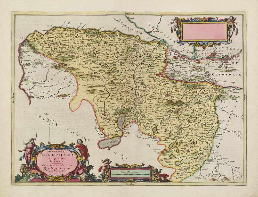 Este mapa antiguo a todo color, extremadamente raro, del condado de Renfrew en Escocia fue creado por el maestro cartógrafo Joan Blaeu desde su taller en Ámsterdam y publicado originalmente en 1665 como parte de su Theatrum Orbis Terrarum Sive Atlas Novus.