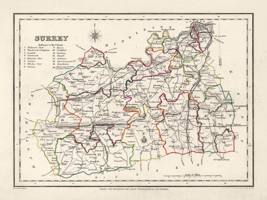 Descubre, explora y enamórate de la encantadora historia de Surrey a través de este notable mapa de 1844 de Samuel Lewis. Una perfecta combinación de historia, arte y cultura, es verdaderamente una excelente adición a cualquier colección o un gran regalo para el apasionado amante de la historia.