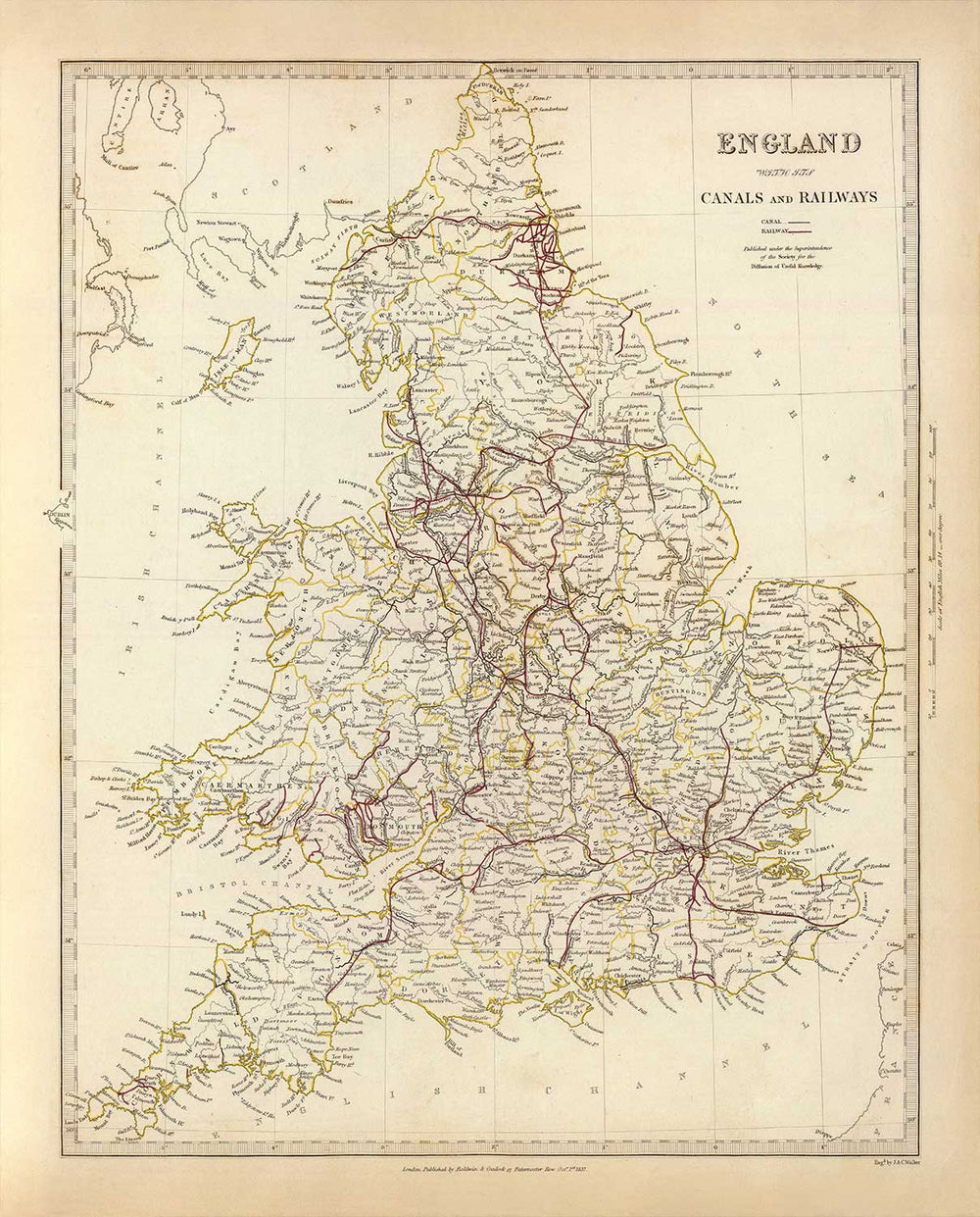 Antiguo mapa de los ferrocarriles y canales de Inglaterra y Gales en 1837 por SDUK: Transporte, Ferrocarriles, Ferrocarriles Nacionales, Ríos
