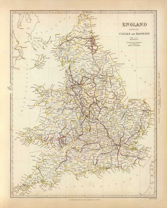 Esta maravillosa antigua mapa de los ferrocarriles y canales de Inglaterra y Gales fue publicado originalmente en 1837. Fue creado por SDUK.