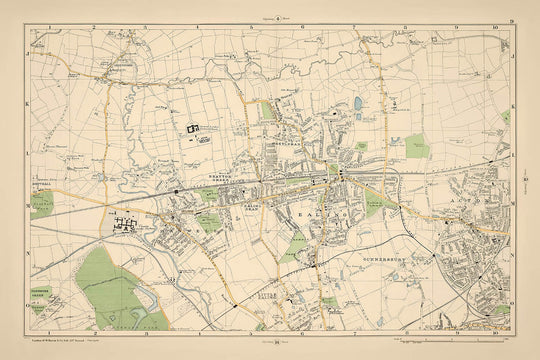 Las vías fluviales y las carreteras intrincadamente tejidas en el diseño del mapa revelan las arterias de la ciudad, con rutas como Uxbridge Road y Acton Lane sirviendo como arterias críticas para el comercio y la comunicación. La representación detallada de estas vías en el mapa refleja la conectividad y el crecimiento de West London, destacando la importancia estratégica de estas rutas en la expansión de la ciudad. Cada calle y avenida cuenta una historia de movimiento, comercio y la energía implacable de una ciudad en ascenso.