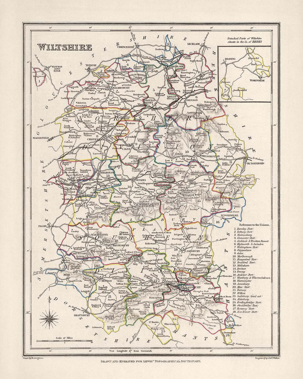 Mapa antiguo de Wiltshire por Samuel Lewis, 1844: Salisbury, Devizes, Marlborough, Chippenham, Stonehenge