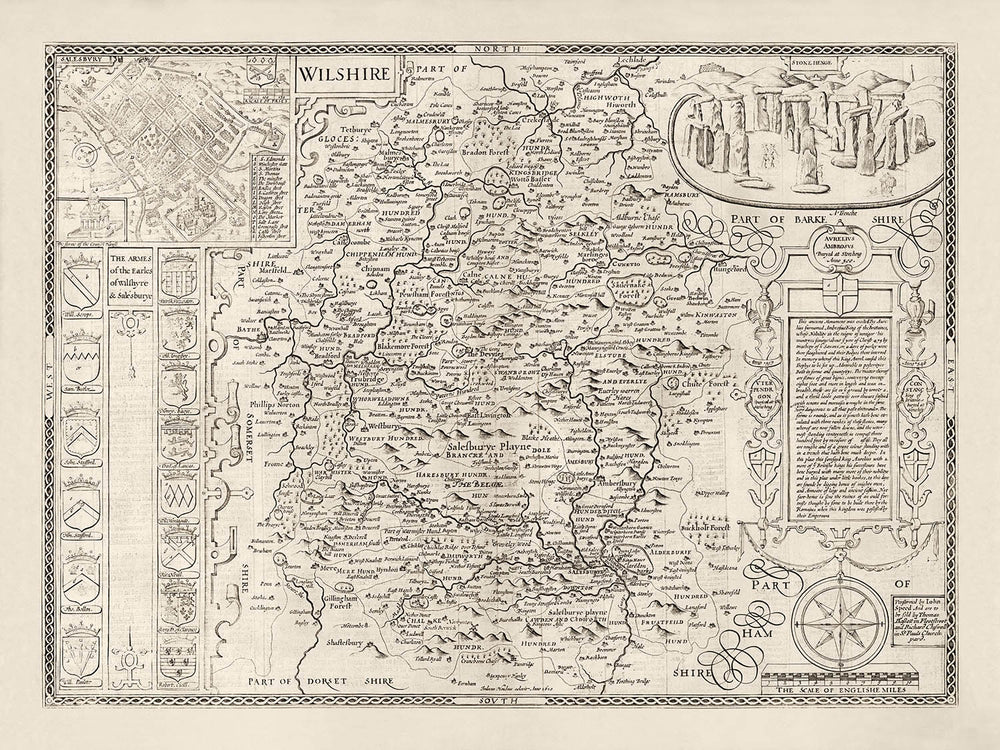 Muchos de los pueblos, aldeas y ciudades en el condado de Wiltshire, en el suroeste de Inglaterra, ya son visibles en este mapa. En la esquina superior izquierda hay un grabado detallado de Salisbury, que entonces (y todavía) era la capital de este antiguo condado. En la esquina superior derecha hay un hermoso grabado de Stonehenge con algunas personas bien vestidas caminando alrededor.
