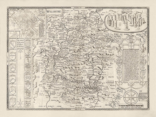 Este antiguo mapa monocromático y maravilloso muestra el antiguo condado de Wiltshire tal como era en 1611. Fue creado por John Speed y grabado por Jodocus Hondius, y publicado originalmente en "El Teatro del Imperio de Gran Bretaña" de Speed.