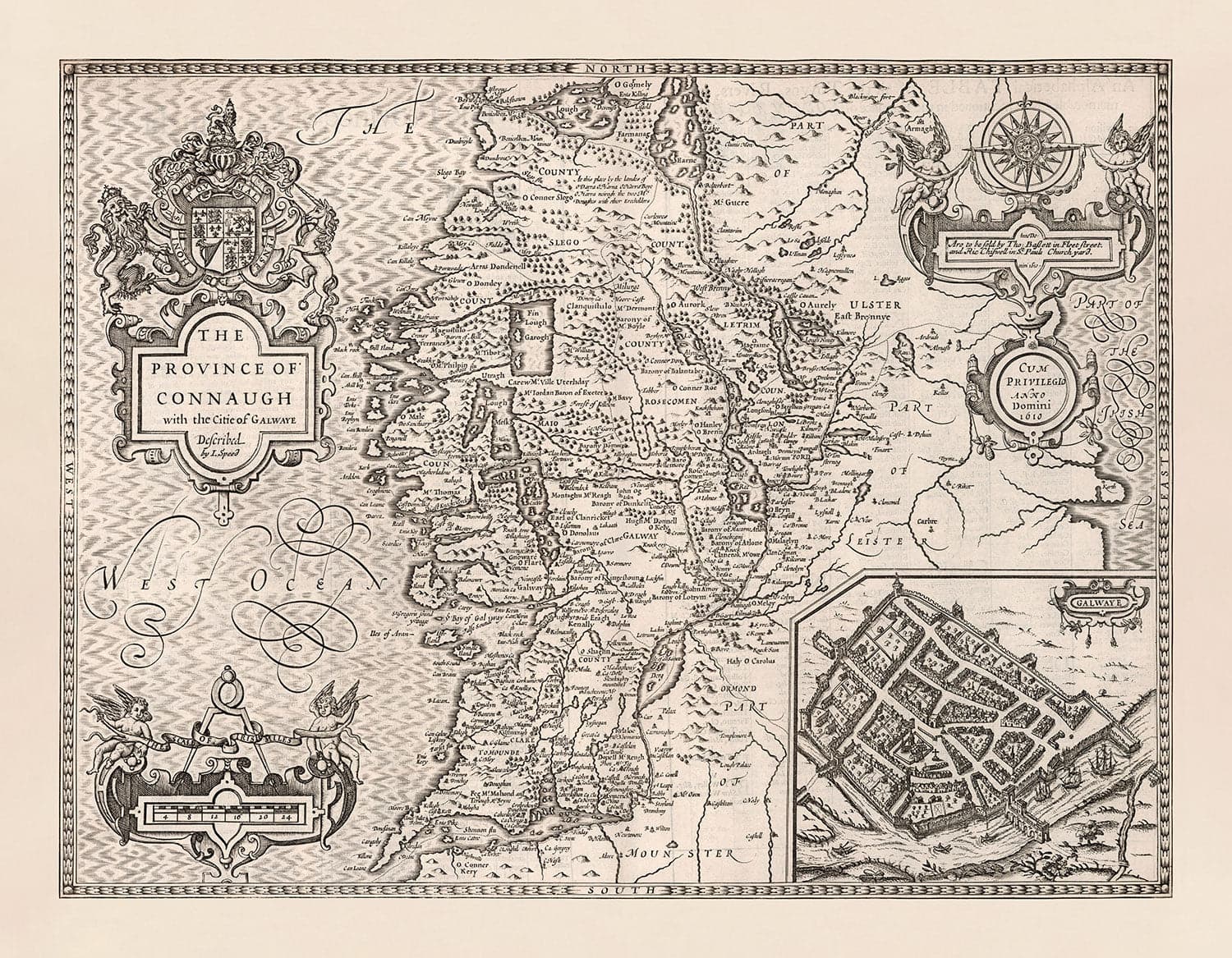 Muchos de los pueblos, aldeas y ciudades de la provincia de Connacht ya son visibles en este mapa.