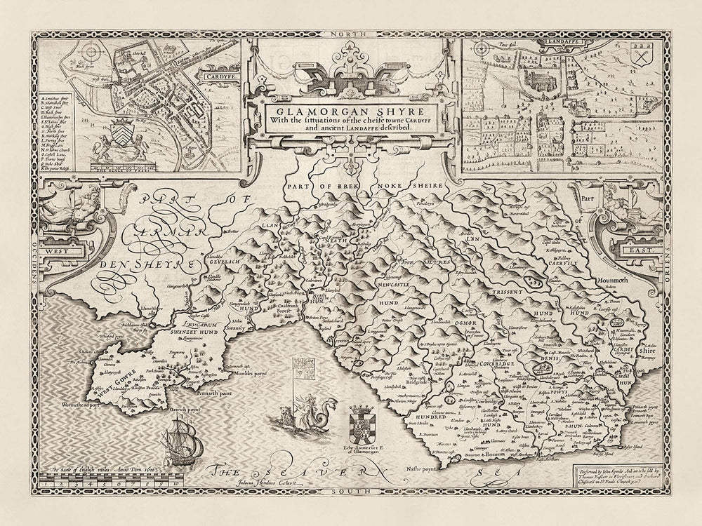Muchas de las ciudades, pueblos y aldeas en Glamorgan ya son visibles en este mapa, incluyendo las ciudades de Swansea y Cardiff. Port Talbot aún no existía por nombre - pero su predecesor, Aberavon, y su larga playa están aquí.