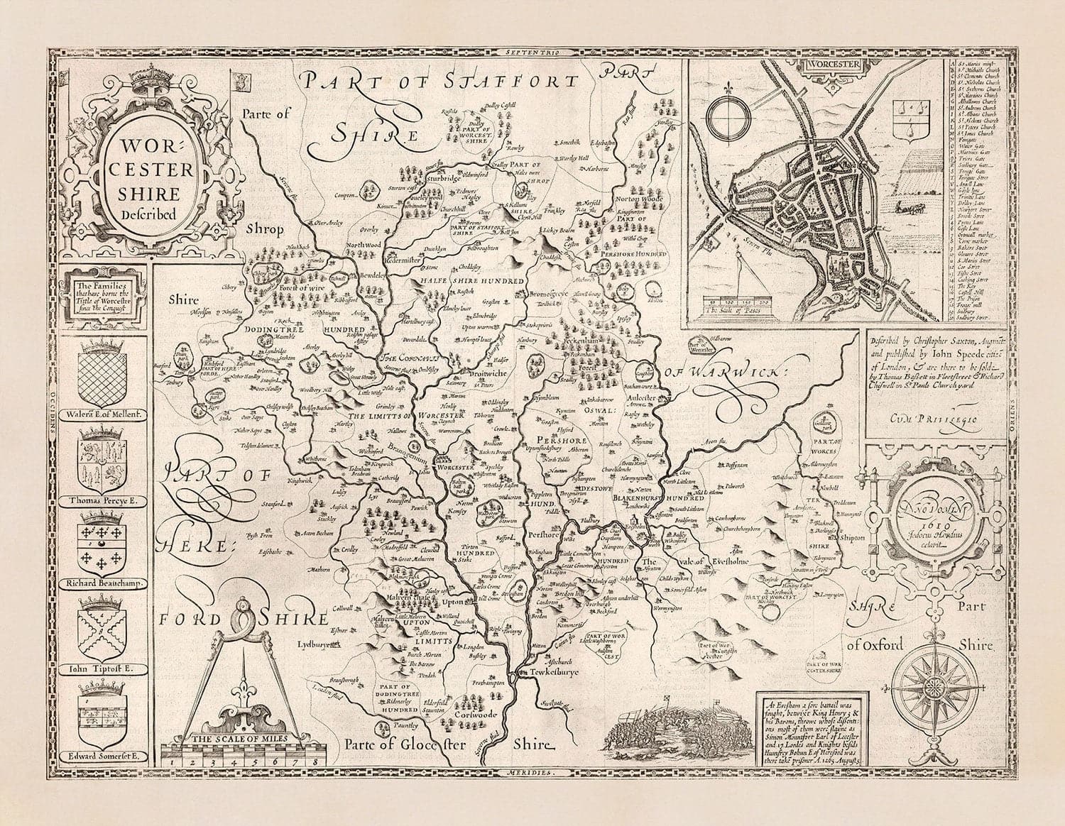 Muchos de los pueblos, aldeas y ciudades de Worcestershire ya son visibles en este mapa, incluyendo Kidderminster, Worcester, Malvern, Droitwich y más.