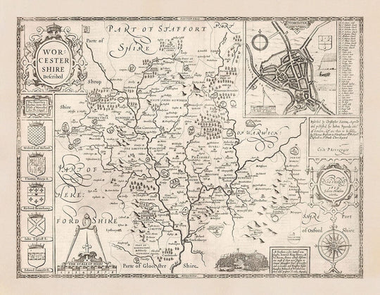 Este antiguo mapa monocromático y maravilloso muestra el antiguo condado de Worcestershire tal como era en 1611. Fue creado por John Speed y grabado por Jodocus Hondius, y publicado originalmente en "El Teatro del Imperio de Gran Bretaña" de Speed.