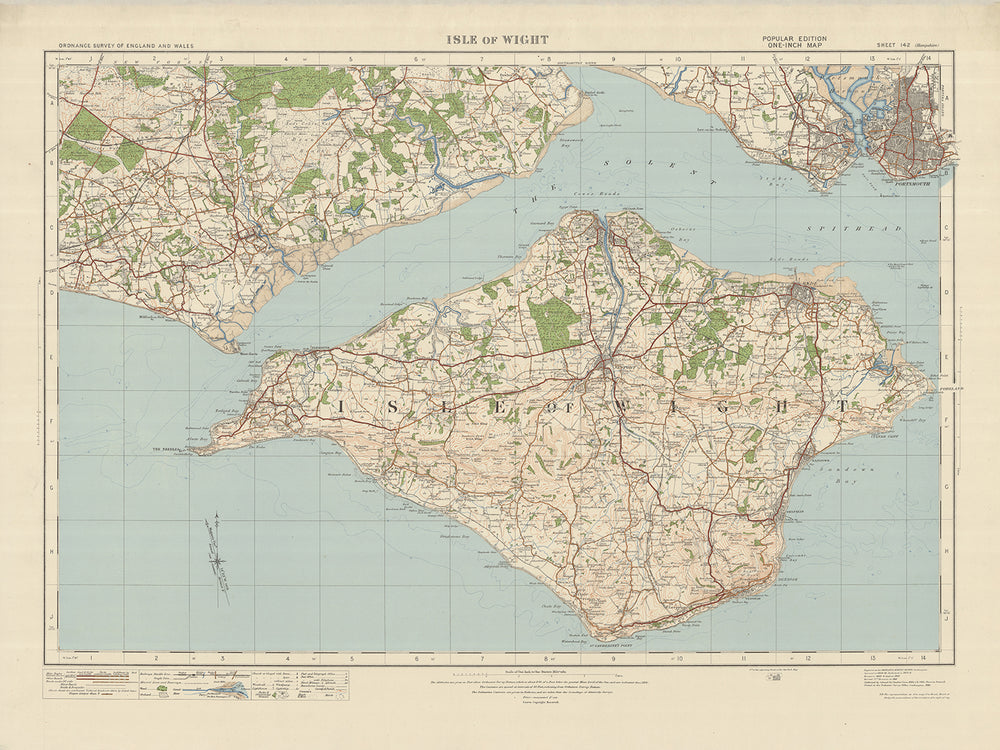 Antiguo mapa Ordnance Survey, hoja 142: Isla de Wight, 1919-1926: Portsmouth, Newport, Ryde, Cowes, Gosport, Castillo de Carisbrooke, The Needles, Osborne House