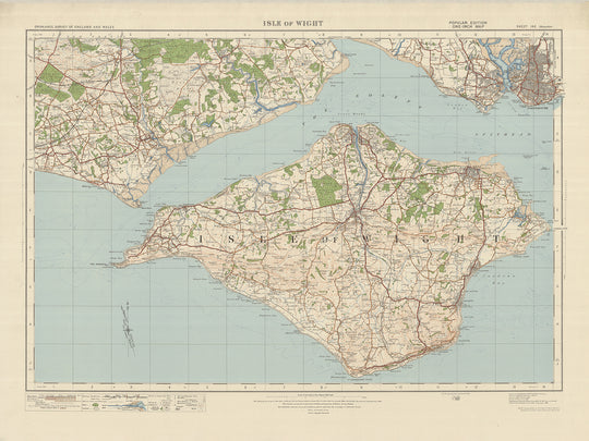 Sumérgete en los intrincados detalles de antaño con el mapa "Hoja 142 - Isla de Wight" de la edición "Popular" de una pulgada de Ordnance Survey, que captura a Inglaterra y Gales en toda su gloria de 1919-1926. Este fascinante artefacto histórico cubre una franja rectangular de tierra de 18 millas de norte a sur, 27 millas de oeste a este y 32 millas a través de la diagonal. En su corazón se encuentra Carisbrooke, un pueblo histórico conocido por su castillo normando.