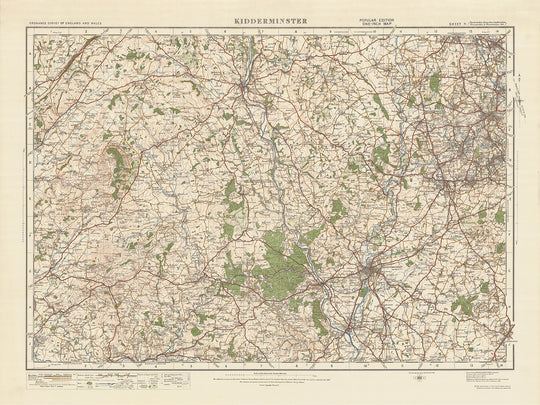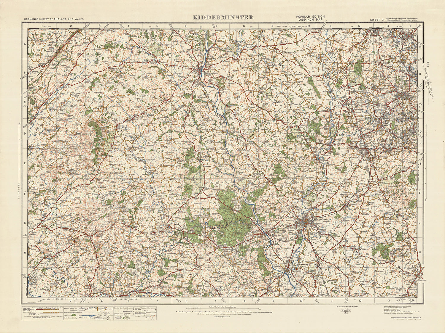 Este mapa antiguo, titulado "Hoja 71 - Kidderminster", es parte de la famosa edición "Popular" de una pulgada de Inglaterra y Gales de Ordnance Survey, publicada en 1925. El mapa muestra los pueblos, ciudades y características fascinantes de la región. , incluidos Dudley, Stourbridge, Stourport-on-Severn, Bridgnorth y la Reserva Natural Nacional Wyre Forest.