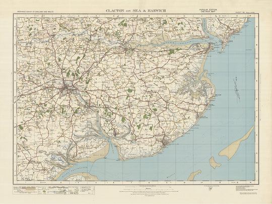 Sumérgete en el pasado con el mapa "Hoja 98 - Clacton on Sea & Harwich" de la edición "Popular" de una pulgada de Ordnance Survey, Inglaterra y Gales, publicada en 1925. Descubre las ciudades históricas, los límites y las características naturales que dieron forma a este región, ofreciendo un cautivador viaje al pasado.