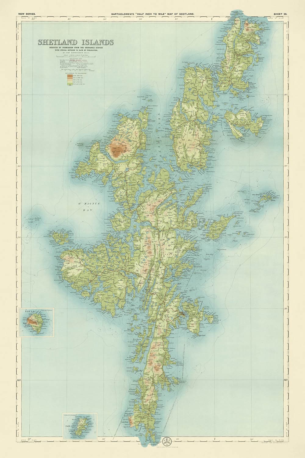 Los asentamientos humanos están prominentemente destacados, con ciudades como Lerwick, Scalloway y Brae marcadas con precisión. Estas ciudades, junto con otras como Mid Yell y Baltasound, están posicionadas en relación con las características naturales de las islas, proporcionando una visión holística de la geografía humana y física. La cuidadosa atención del mapa tanto al entorno natural como al construido lo convierte en un recurso indispensable para entender las Islas Shetland tal como eran a principios del siglo XX. Este mapa no es solo una representación de la geografía; es una ventana al pasado, ofreciendo perspectivas sobre las vidas y paisajes de una era pasada.