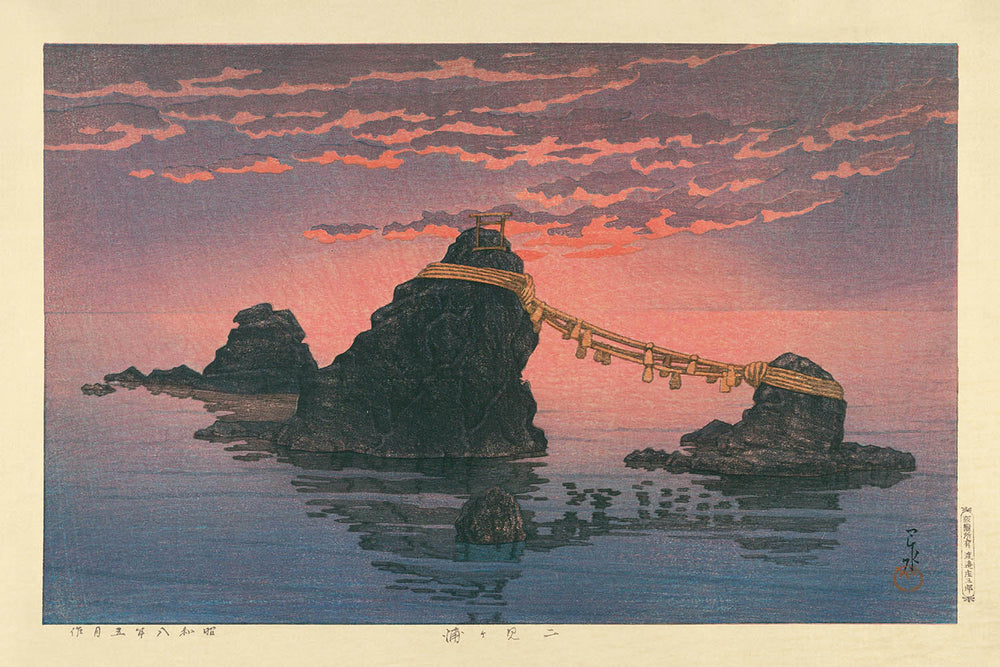La importancia de Hasui Kawase radica en su maestría para transmitir tranquilidad y belleza en sus representaciones de la naturaleza. Su trabajo se destaca por su meticuloso detalle y atmósfera, que "Futamigaura Sea and Rocks" muestra brillantemente. Los morados y rosas dominan la escena con una paleta suave y armoniosa típica del estilo de Kawase, atrayendo al espectador hacia la tranquila inmersión de la pieza. La yuxtaposición de tierra y mar, complementada por notas más suaves de los tonos del cielo vespertino, invita a admirar tanto la destreza de Kawase como el mundo natural que él tanto veneraba.