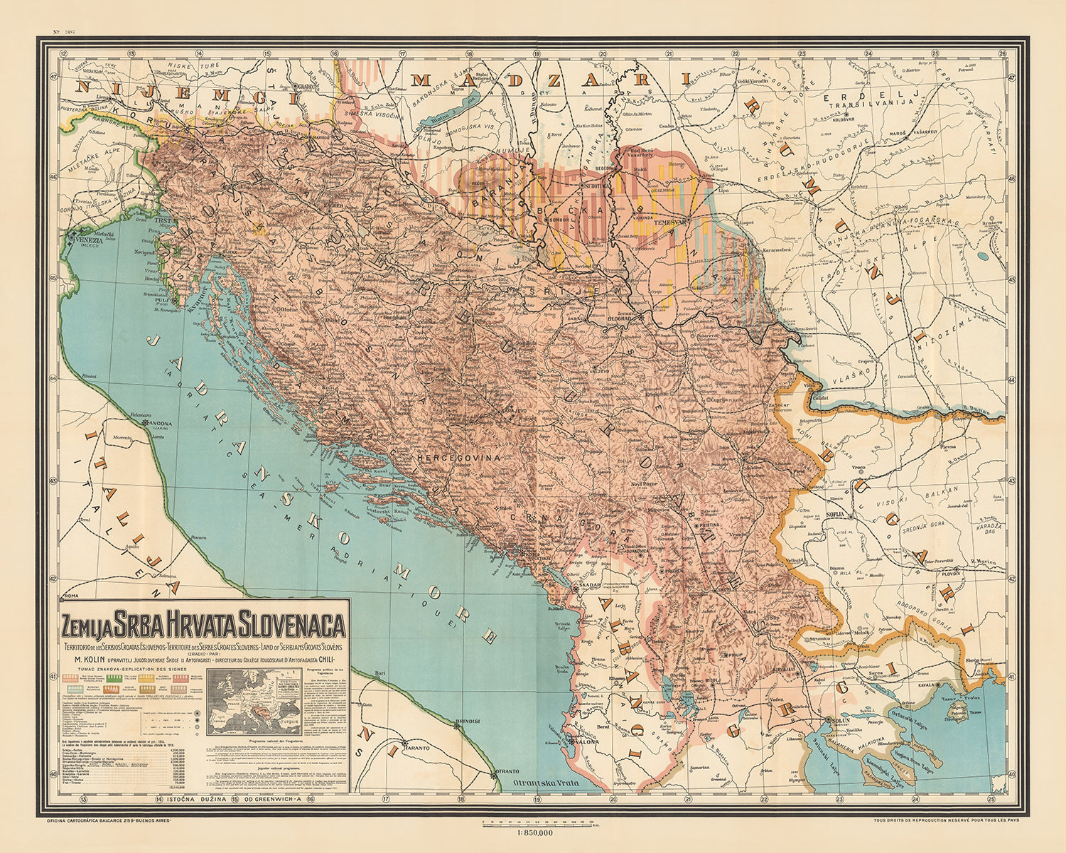 El mapa proporciona un rico tapiz de las regiones que cubre, incluyendo Serbia, Croacia, Eslovenia, Bosnia y Herzegovina, y Montenegro, junto con partes de Italia, Austria, Hungría, Rumanía, Bulgaria y Albania. El mar Adriático (Jadransko More) forma un impresionante telón de fondo para los territorios occidentales, mientras que el sombreado de relieve da vida a las escarpadas cadenas montañosas y serenos ríos que cruzan el paisaje. La inclusión de tablas de población y una leyenda codificada por colores mejora aún más la utilidad y profundidad del mapa, ofreciendo una visión comprensiva de los territorios yugoslavos previstos.