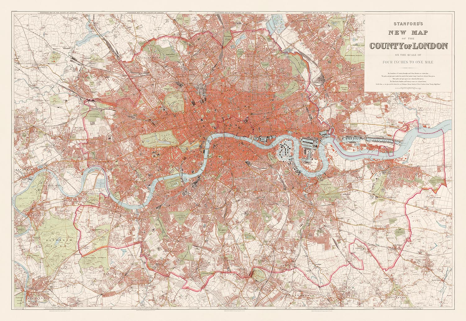 Gran Mapa de Pared de Londres por Stanford, 1905: Mapa Victoriano de Color Rojo