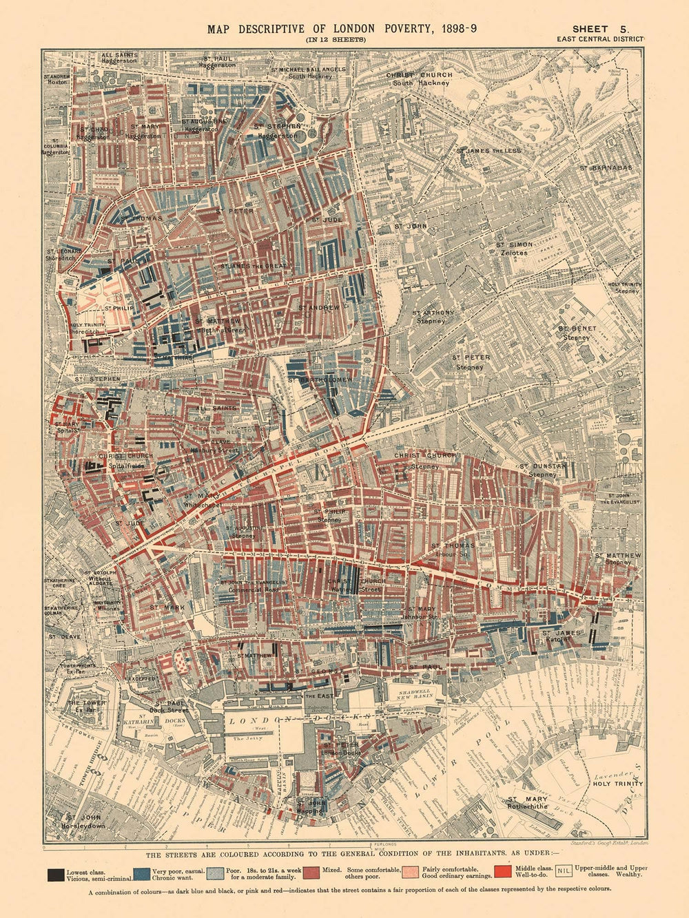 El nivel de detalle en estos mapas es impresionante, con casas individuales coloreadas para mostrar si son "semi-criminales viciosos" (negro); "muy pobres" (azul oscuro); "pobres" (azul claro); "mixtos" (rojo); "bastante cómodos" (rojo claro); "clase media" (rojo brillante); "clase media alta y alta" (amarillo).