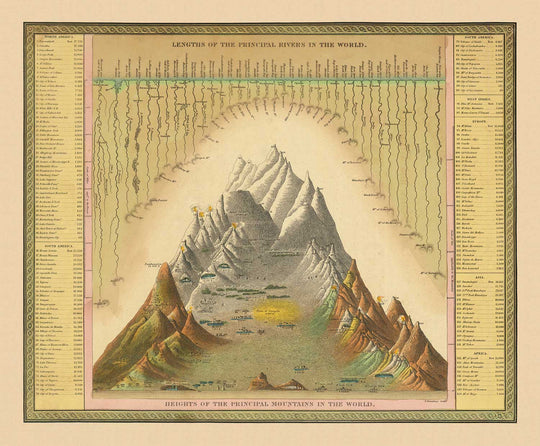 Este gráfico comparativo de los ríos más largos y las montañas más altas del mundo muestra todos los paisajes naturales conocidos en ese momento. Curiosamente, el Nilo no se considera el río más largo a mediados del siglo XIX, cediendo ese lugar al río Misisipi en América del Norte.