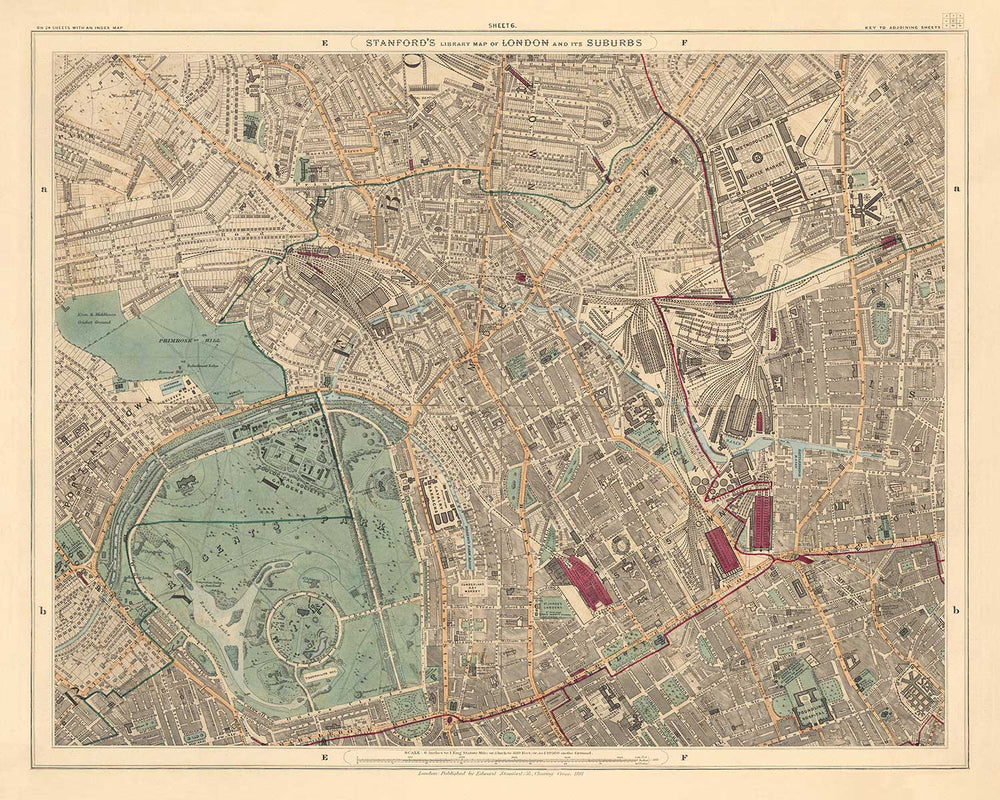 En este mapa puedes ver claramente: Regents Park, Camden Town, Somers Town, Kentish Town, Primrose Hill, el Ferrocarril Metropolitano (subterráneo), la estación de tren de Kings Cross y la Terminal Ferroviaria Midland (que más tarde se convertiría en St Pancras). y todo tipo de cosas antiguas geniales, como el Mercado de Ganado que más tarde se convertiría en el Parque Caledonian.