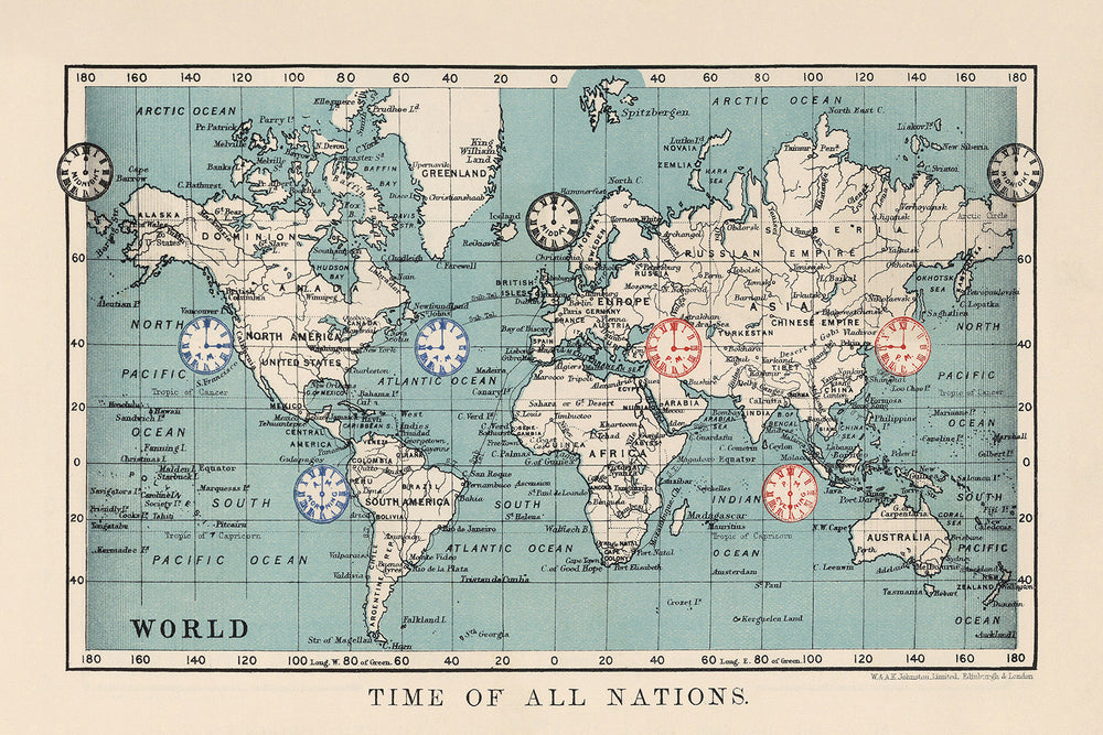 El diseño del mapa es funcional y estéticamente agradable. La clara delimitación de continentes, países y ciudades principales, junto con el preciso sistema de cuadrícula de latitud y longitud, facilita la localización de lugares específicos. Los relojes que indican las horas locales en varias regiones añaden un elemento dinámico al mapa, convirtiéndolo no sólo en una representación estática del mundo sino en un documento vivo que refleja el movimiento del tiempo. El mapa también incluye anotaciones con nombres coloniales, que ofrecen una visión del contexto geopolítico de la época.