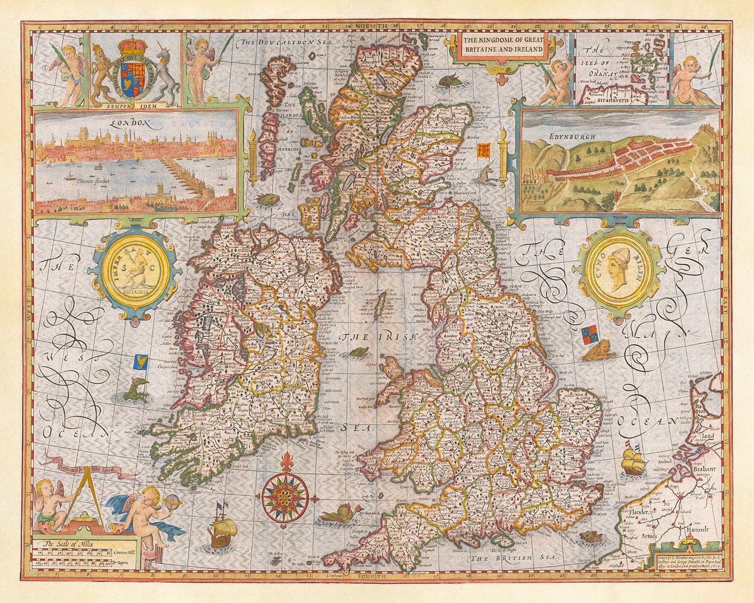 Esta es una de las mapas más antiguos, finos e importantes de las Islas Británicas completas - Inglaterra, Irlanda, Escocia y Gales. Fue publicado originalmente en 1611 por John Speed, uno de los padres de la cartografía y el cartógrafo más notable de Inglaterra de la era jacobina.