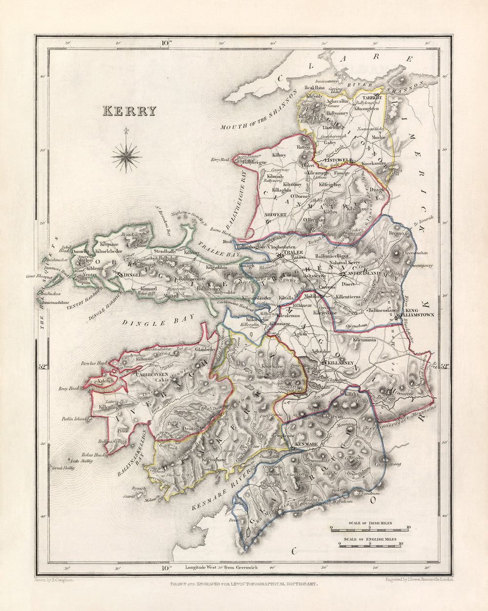 Mapa antiguo del condado de Kerry por Samuel Lewis, 1844: Tralee, Killarney, Dingle, Kenmare y Listowel