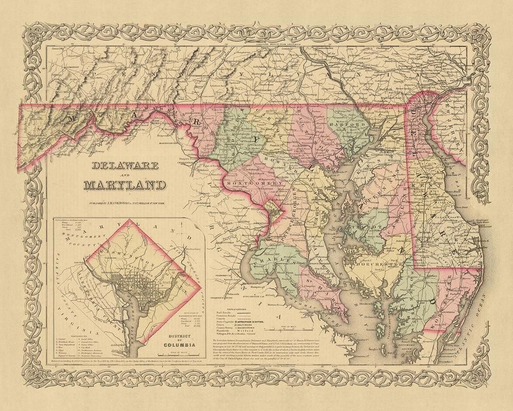 Esta pieza excepcional es un antiguo mapa de Delaware, Maryland y Washington DC, creado por el renombrado cartógrafo JH Colton en 1859. Colton es ampliamente reconocido como uno de los mejores cartógrafos estadounidenses de su época, y su meticulosa atención al detalle es evidente en esta hermosa representación de la región. El mapa se remonta a una época en la que Estados Unidos estaba en su infancia y la región aún estaba en gran medida inexplorada y subdesarrollada.