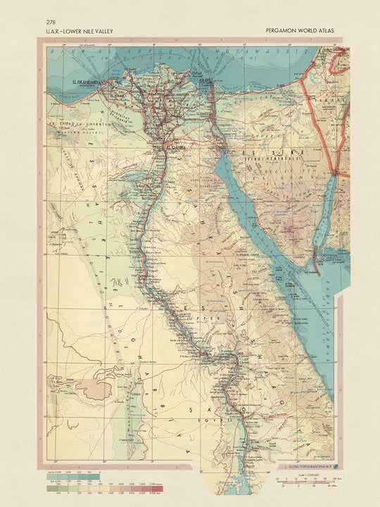 Este mapa de 1967 de la República Árabe Unida, o Egipto, es un mapa político y físico detallado que proporciona una descripción completa de la geografía y las divisiones políticas del país. Publicado por el Servicio de Topografía del Ejército Polaco, el mapa es un testimonio de la precisión y la experiencia cartográfica de sus creadores.