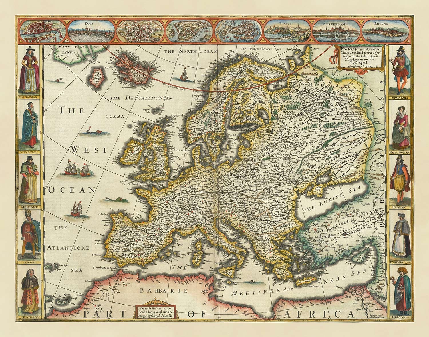 Alrededor del borde del mapa hay encantadoras viñetas de los ciudadanos de Europa (incluida una mujer inglesa, un veneciano, etc.) y vistas detalladas de las principales ciudades de Europa en ese momento: Londres, París, Roma, Estambul, Venecia, Praga, Ámsterdam y Lisboa.
