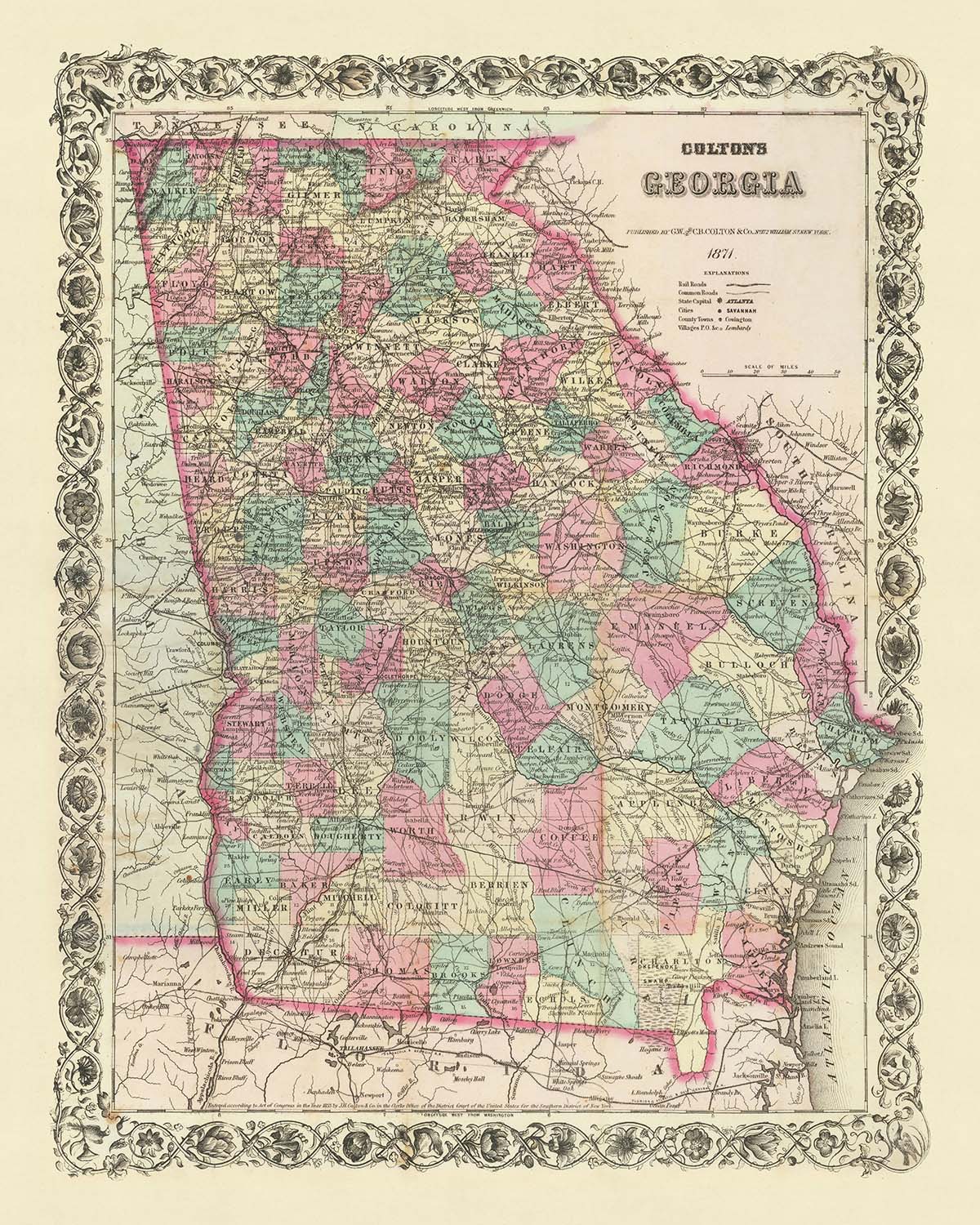 En 1871, muchos de los asentamientos que conocemos hoy aún no se habían fundado, y muchos de los nombres y fronteras que existían entonces han sufrido cambios significativos. Este mapa ofrece una instantánea del pasado de Georgia y presenta los cinco asentamientos más notables de la época: Savannah, Augusta, Columbus, Macon y Atenas. Cada ciudad ocupa un lugar único en la historia de Georgia, lo que contribuye al rico tejido cultural del estado.