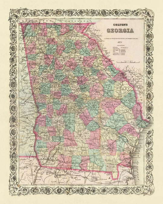 Sumérgete en la fascinante historia de los Estados Unidos con este exquisito mapa antiguo de Georgia, elaborado por JH Colton en 1871. Colton, ampliamente reconocido como el cartógrafo estadounidense más destacado de su tiempo, ha capturado maravillosamente la esencia de Georgia en los primeros años de la historia de la nación. Este mapa sirve como testimonio de la naturaleza dinámica de la civilización humana, reflejando el crecimiento y la evolución de la región durante los últimos 150 años.