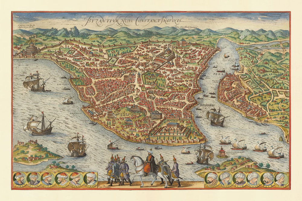 Mapa antiguo de Estambul, Constantinopla en 1572 por Georg Braun: Byzantium, Bosporus, Golden Horn, Topkapi Palace