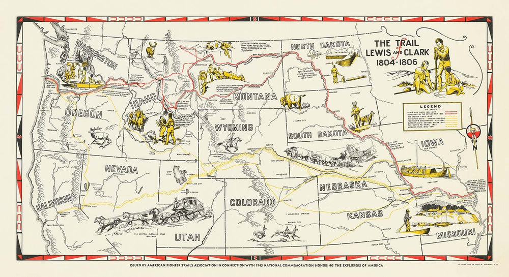 El mapa también muestra el rastro de Oregon de 1843, Rastro mormón de 1846-47, el Pony Express de 1860-61, y algunas otras rutas en todo el país. Este mapa se publicó en 1945 para honrar estos senderos primitivos forjados por los exploradores.