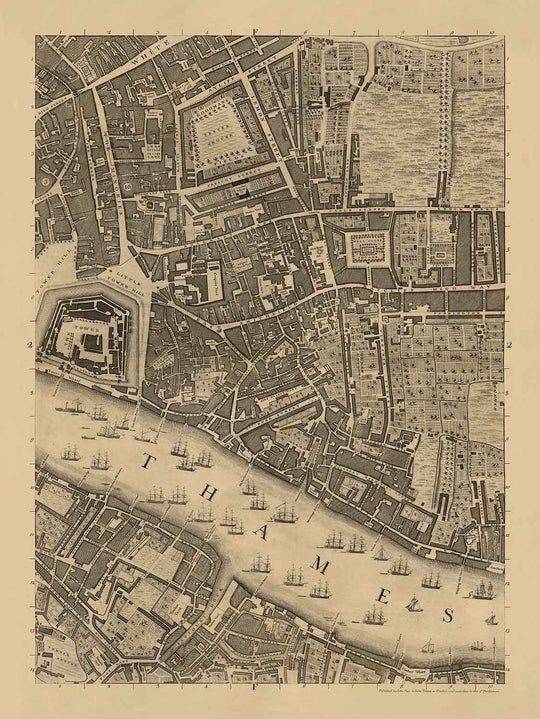 El punto focal de este mapa es la Torre de Londres, pero este mapa también incluye Shad Thames, St Saviours Dock y las áreas que se convertirían en St Katherine Dock y London Docks. Podrías reconocer algunos otros puntos de referencia si conoces bien Tower Hamlets y Bermondsey.
