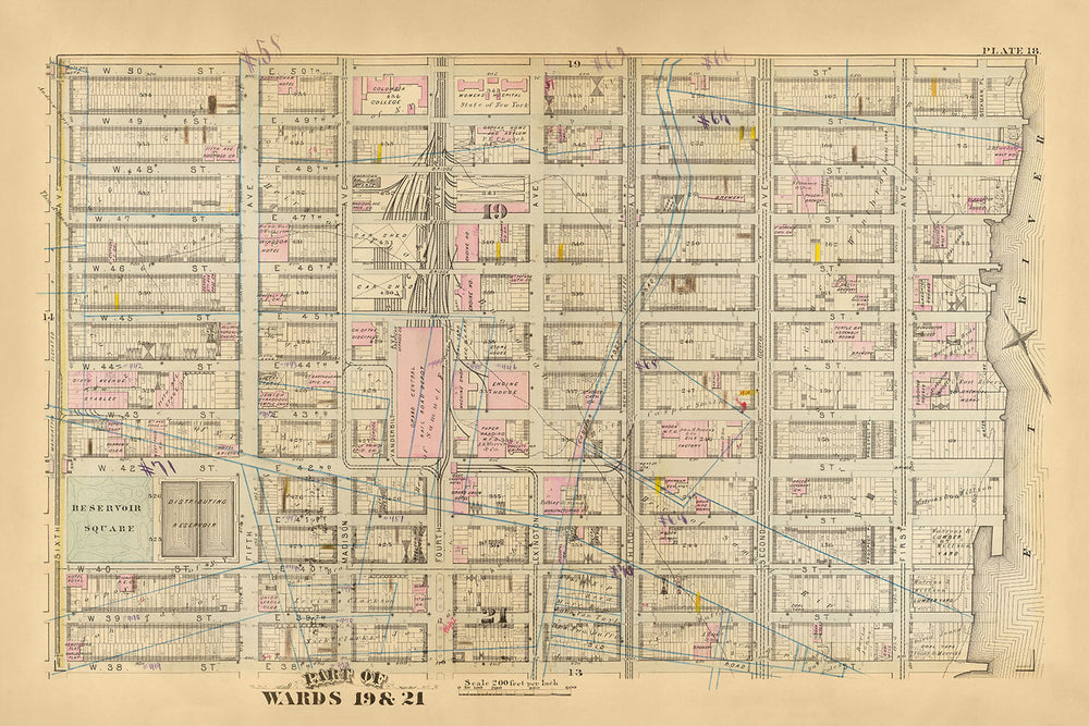 Este exquisito mapa de 1879, coloreado a mano y litografiado por GW Bromley, ofrece una representación meticulosa de partes de los distritos 19 y 21 de la ciudad de Nueva York, que abarcan gran parte de Midtown. En un momento en que Nueva York se estaba transformando rápidamente en una metrópolis moderna, este mapa captura el paisaje urbano con increíble detalle, mostrando edificios, bocas de incendio e incluso los cursos de agua originales y las líneas agrícolas que alguna vez atravesaron el área.