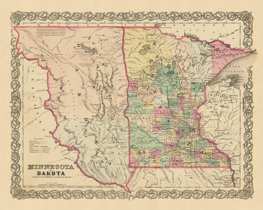 Este mapa tiene un significado histórico, no sólo como representación de Minnesota y Dakota a mediados del siglo XIX, sino también como testimonio de la destreza cartográfica de Colton. Fue creado durante un período en el que Estados Unidos todavía estaba en su infancia y muchos asentamientos aún estaban por fundarse. Es probable que las características geográficas, los nombres y las fronteras representados en este mapa hayan sufrido cambios significativos desde 1860, lo que lo convierte en un artefacto fascinante para historiadores, cartógrafos y cualquier persona interesada en el pasado.