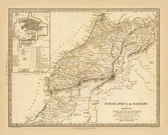 Este mapa de Marruecos de 1836, publicado por SDUK, es un mapa político y físico detallado que proporciona una gran cantidad de información sobre el país y sus alrededores. El mapa está grabado, con el relieve mostrado por hachuras y alturas puntuales, y los límites y lagos están coloreados a mano. También incluye un mapa adicional de Marruecos, que está dibujado a una escala de aproximadamente 1:31,000.