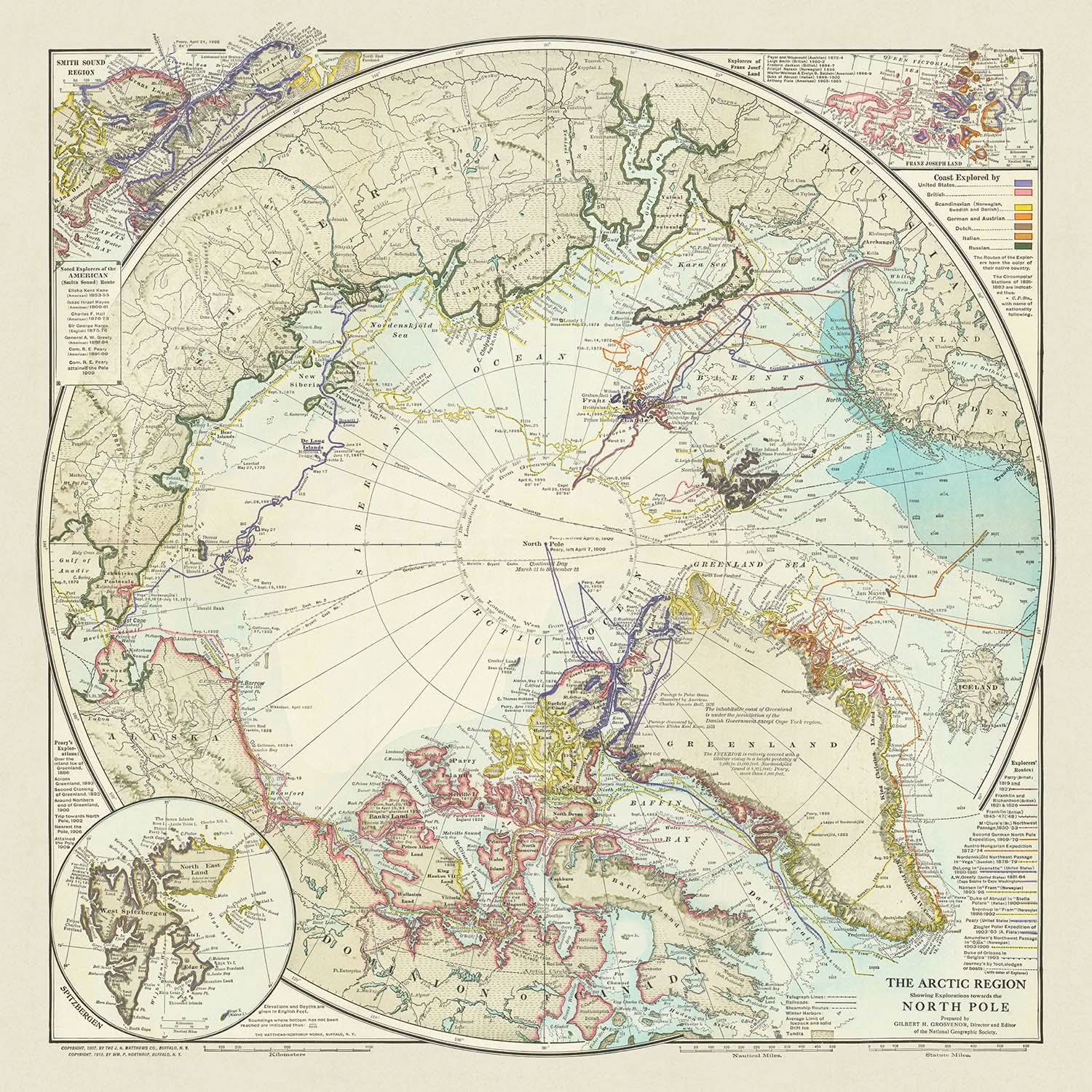 Históricamente significativo, este mapa marca un momento crucial en la exploración ártica. Captura la esencia del legendario viaje de Robert Peary, que fue celebrado como la primera expedición exitosa al Polo Norte. Este mapa fue elaborado en un momento en que la Sociedad Nacional Geographic estaba a la vanguardia de la promoción del conocimiento geográfico, sirviendo como una herramienta educativa para el público estadounidense. Se erige como un tributo a los exploradores que arriesgaron sus vidas para expandir los límites del conocimiento humano.