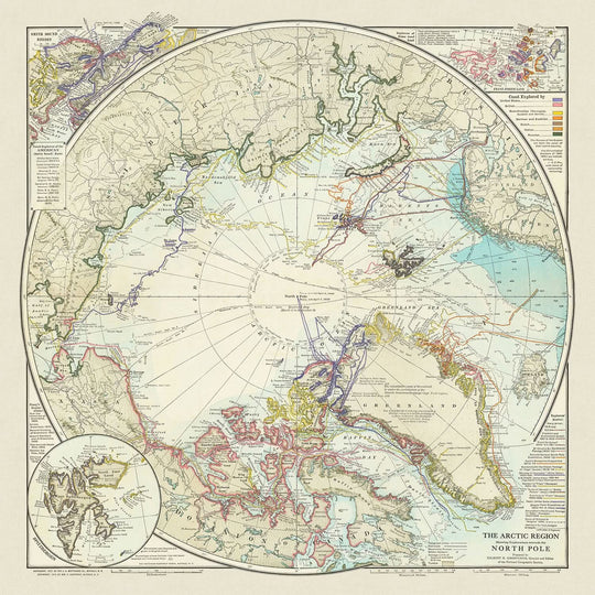 El mapa no es solo una representación de características geográficas, sino un testimonio de la perseverancia y curiosidad humanas. Retrata elegantemente la región ártica, incluyendo Groenlandia, Canadá y partes de Rusia, así como los vastos océanos Ártico y Atlántico Norte. La inclusión de mapas insets de Smith Sound, Franz Josef Land y Spitzbergen añade profundidad y contexto, ofreciendo una visión completa de los desafíos enfrentados por los exploradores en estos terrenos traicioneros. Cada ruta y punto de referencia está meticulosamente detallado, reflejando los esfuerzos minuciosos de aquellos que se aventuraron en lo desconocido.